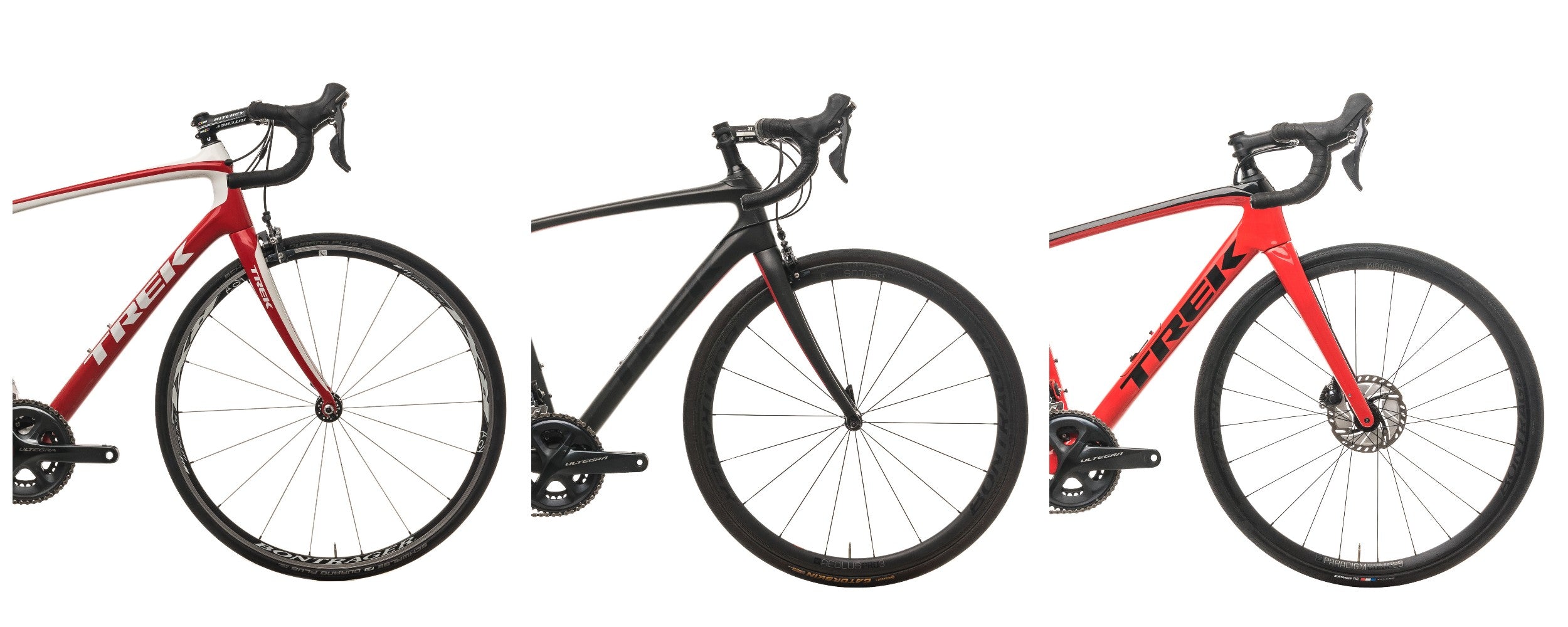 Generally, if you want disc brakes, look at 2015 models and newer. Trek offered the Domane with rim brakes from 2013 to 2019. From 2020 onward, the new generation Domane will only be available with disc brakes. If you want electronic shifting, look for 2017 and newer. And if you want clearance for tires as wide as 38mm, or aero features, look at the 2020 and 2021 models.